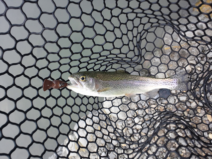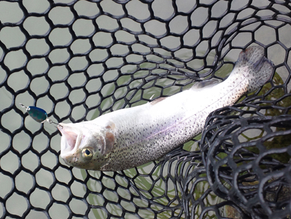 今の時期は朝4時半から営業しているので少しお得です。 朝イチはティアロ1.6gシルバーで表層から開始しましたが、アタリはあるもののなかなかヒットしません。 そこでウエイトを1.3gブルーヤマメにして表層少し下を丁寧に探るとヒットししばし連発。 その後、カラーチェンジをし様子を見ましたが、少しアタリが遠くなって来たのでニブル08gヨネスティブルーに変えてじっくりと見せてカラーチェンジしながらポツポツと釣りました。 |