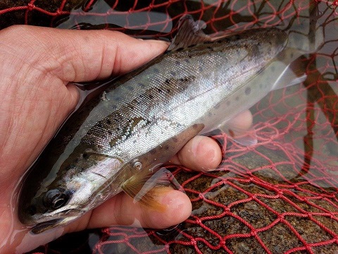 先日の渓流釣行にて極薄らとパーマークが残った大ヤマメが釣れましたのでレポートいた します。