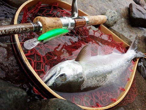 銀色に輝く魚体を確 認してからはグラスロッドに十分仕事をさせ、