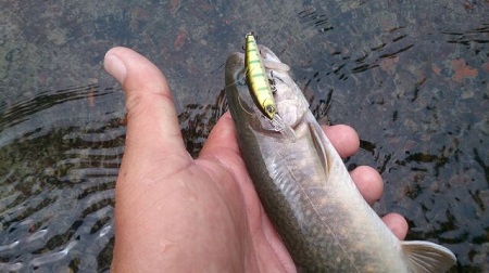 軽く誘い、止めてラインスラッグを出してミノーが浮き上がる寸前にバイトが集中。