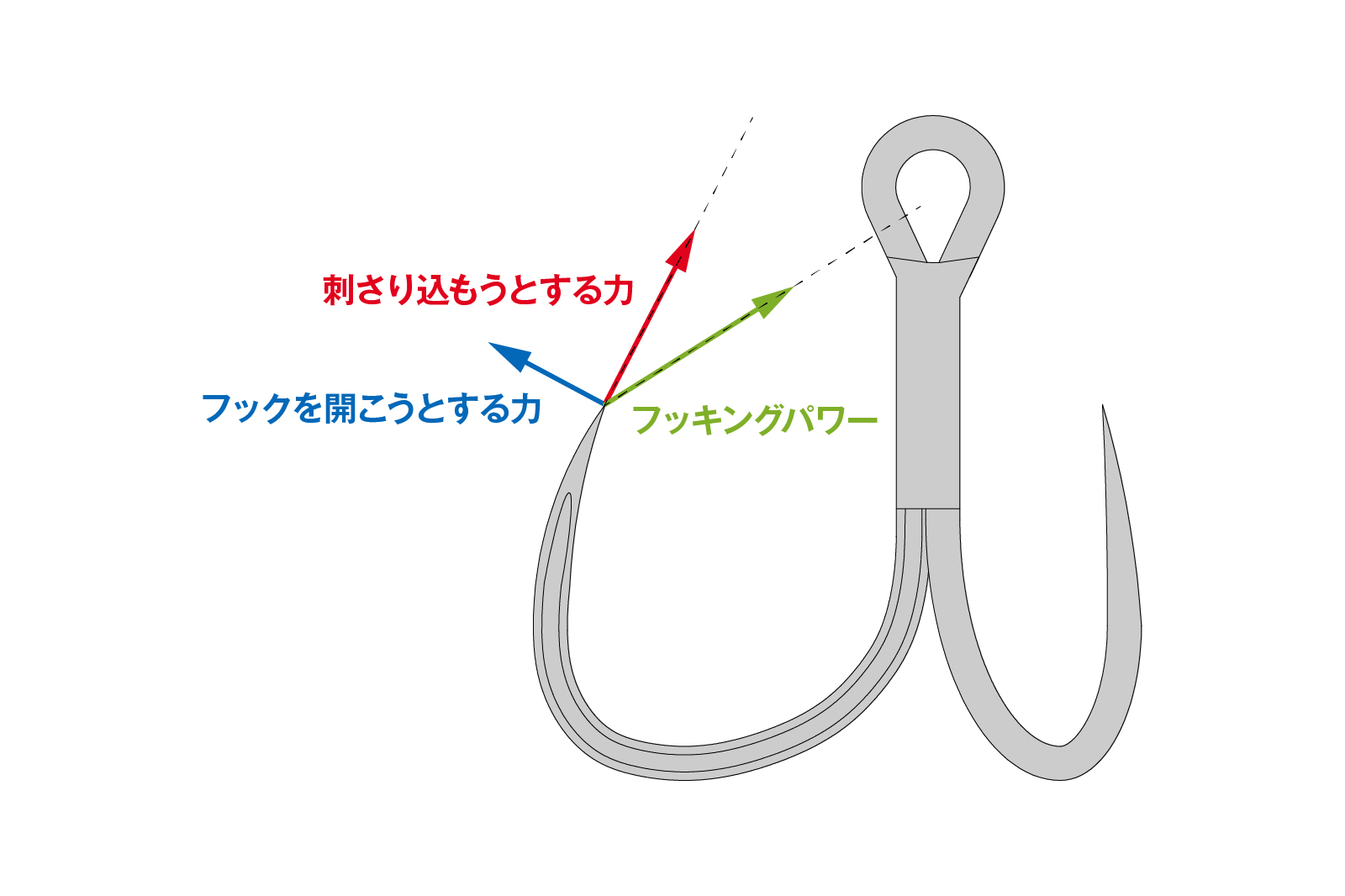 また、逆にアプローチアングルが大きくなればなるほど、アングラー側による強いフッキングパワーが必要になります。
