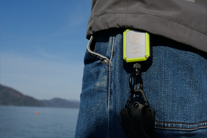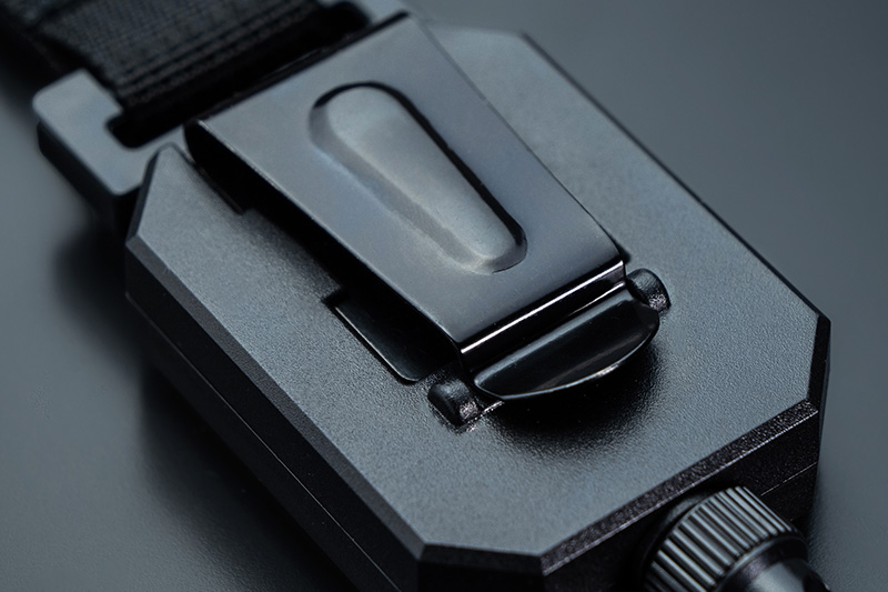 カラビナ仕様で、バッグやバッカンなどに取り付けられることはもちろん、本体裏にはベルト用バックルが付属し、パンツやベルトなどにも取り付け可能です。