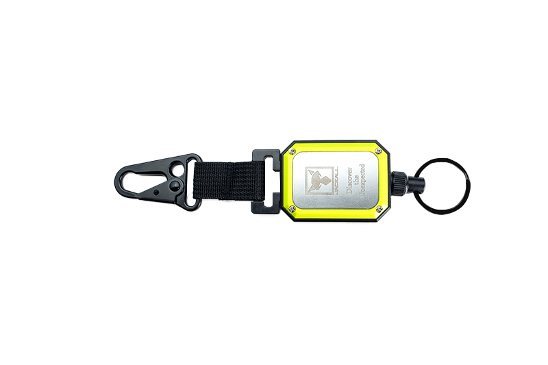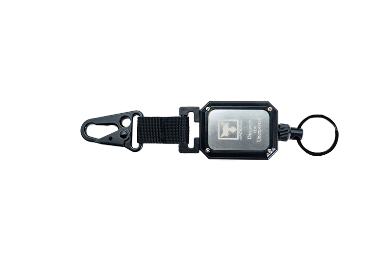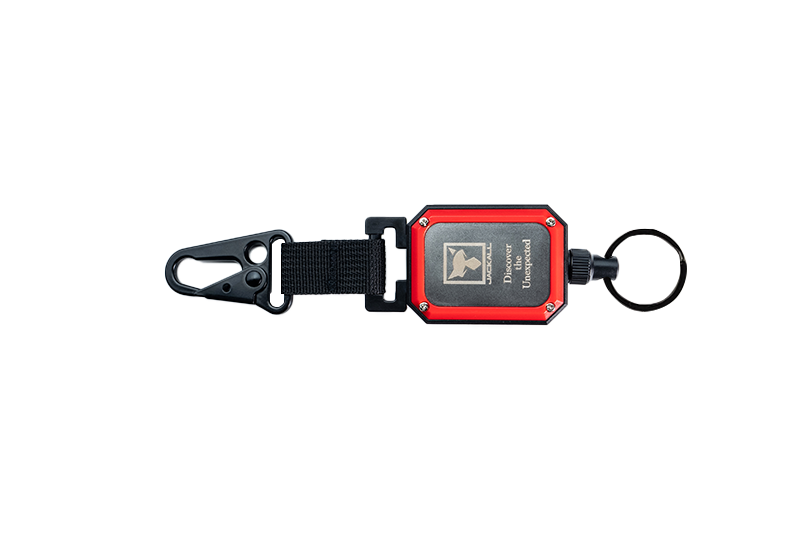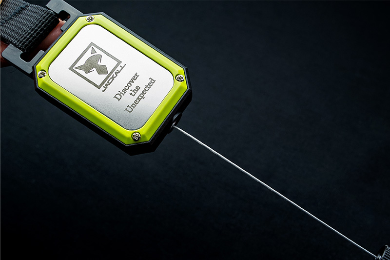 ラインカッターなどの小物を取り付けることができるピンオンリール。ワイヤーはステンレス製のメタルワイヤーを採用することで、不意な断裂に対する強度を確保。