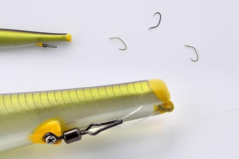 テールに設けた斜めアイにハリスを通すことで、針を上向きにセットでき根掛を減少させることが可能となります。