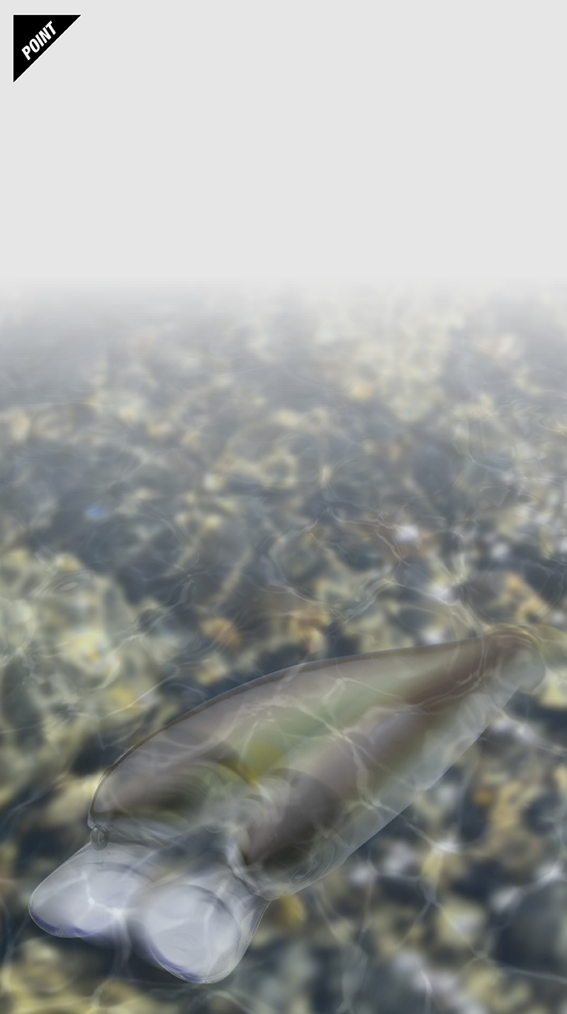 オトリミノーシリーズに待望のシャロー攻略用スリムタイプが登場。浅い場所でトゥイッチなどのアクションをさせても破綻しにくく浅瀬を広範囲に効率よく探る事が可能となりました。また、引き抵抗も少なくどなたでも扱いやすくなっています。