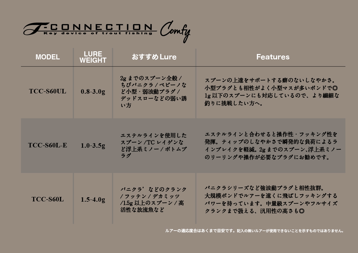 エリアトラウトを本気で楽しみたい方へ、奥深いエリアトラウトロッドをシンプルに表現しロッド選びの迷いを解消するシリーズがこのT-CONNECTION Comfy/Tコネクションコンフィーです。